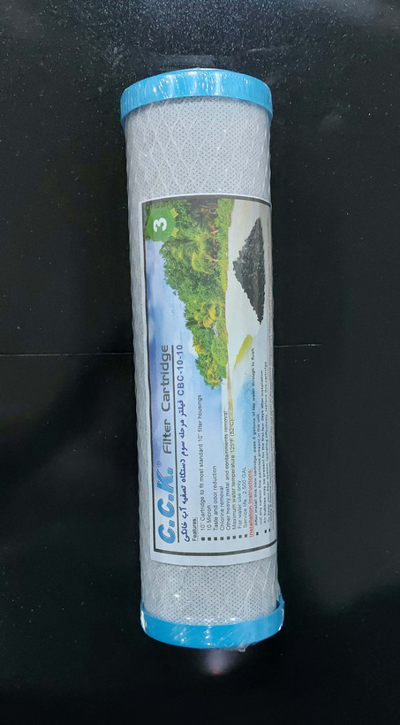 فیلتر شماره سوم دستگاه تصفیه آب خانگی که شباهت زیادی به فیلتر مرحله دوم دارد ، کربن بلاک نامیده میشود و با یک نوار توری پوشانده شده و تکمیل کننده عملکرد فیلتر مرحله دوم میباشد و ذرات بزرگتر از 5 میکرون را حذف می نماید . زمان تعویض این فیلتر نیز همانند فیلتر شماره 2 هر 6 ماه یکبار بوده و این دو فیلتر(مرحله 2 و 3) با هم تعویض میگردد
